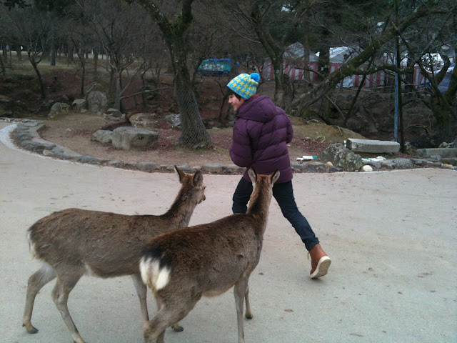 奈良公園でまずは鹿せんべいを買って、鹿とたわむれ